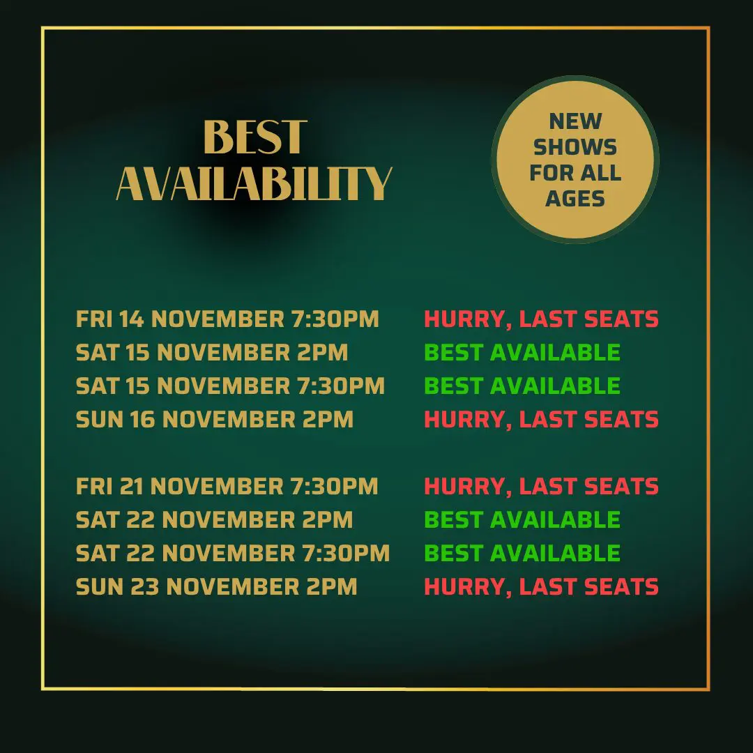 We offer two show times to suit all ages, 2pm and 7.30pm.