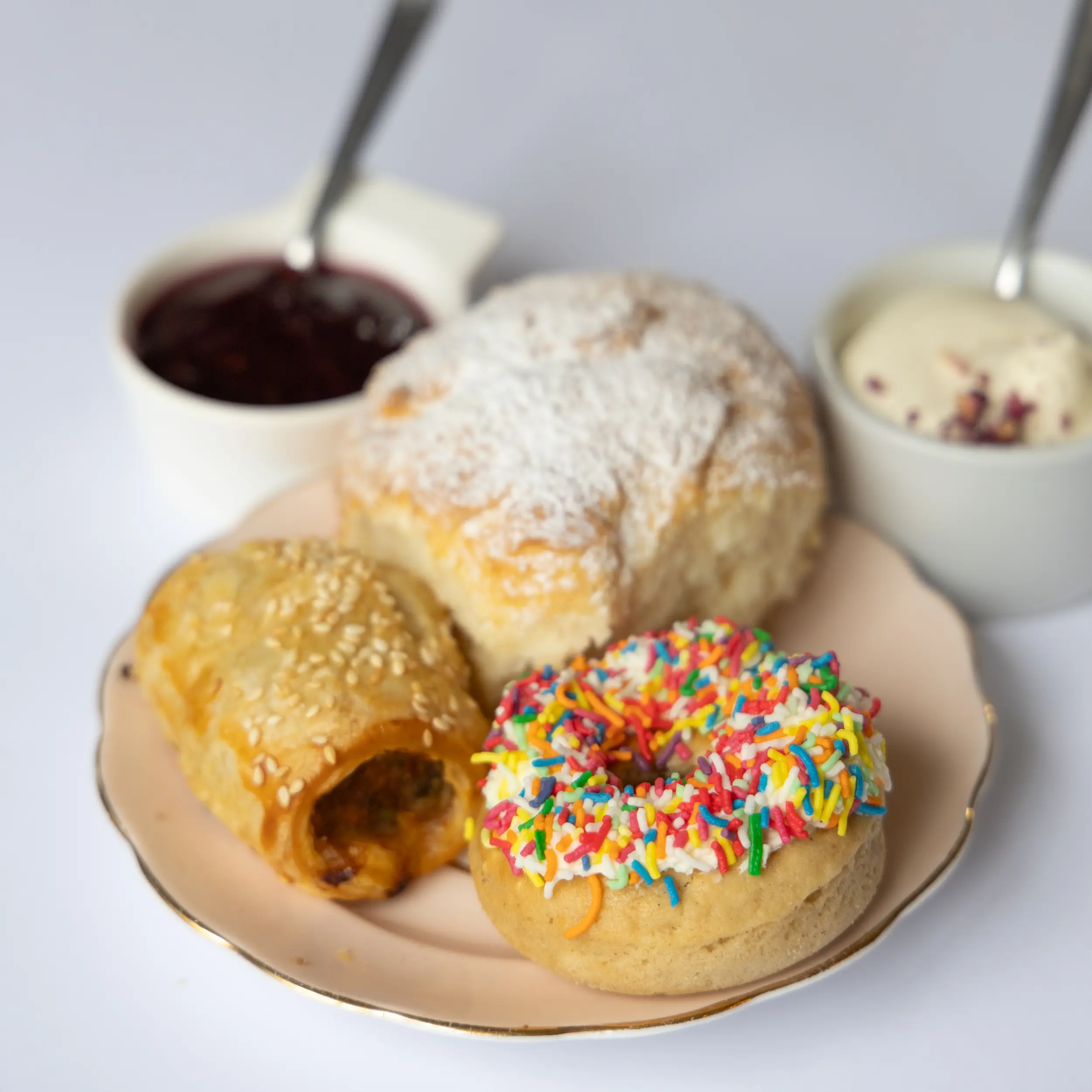 The Junior experience includes: Sausage Roll, Scone with Jam & Cream, Funfetti Doughnut.